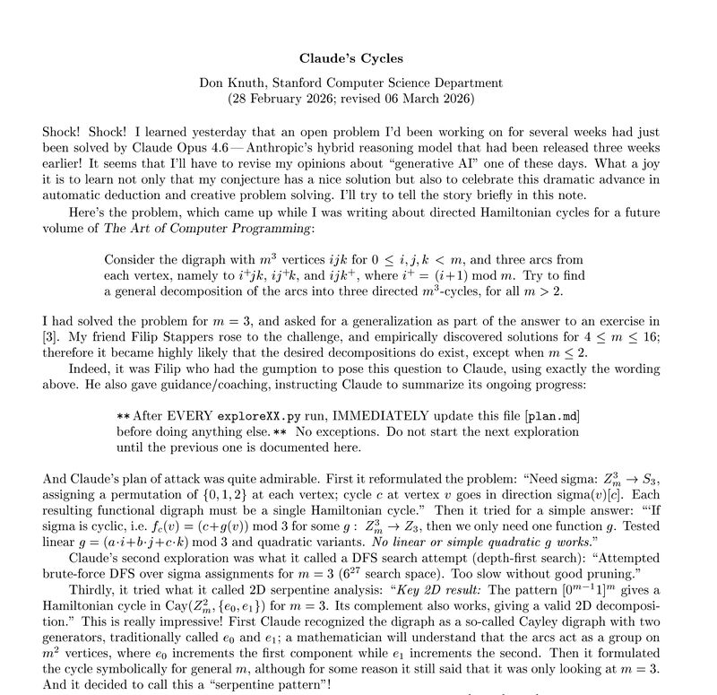 Donald Knuth’s Hamiltonian cycle decomposition problem from The Art of Computer Programming was solved by Claude Opus 4.6.